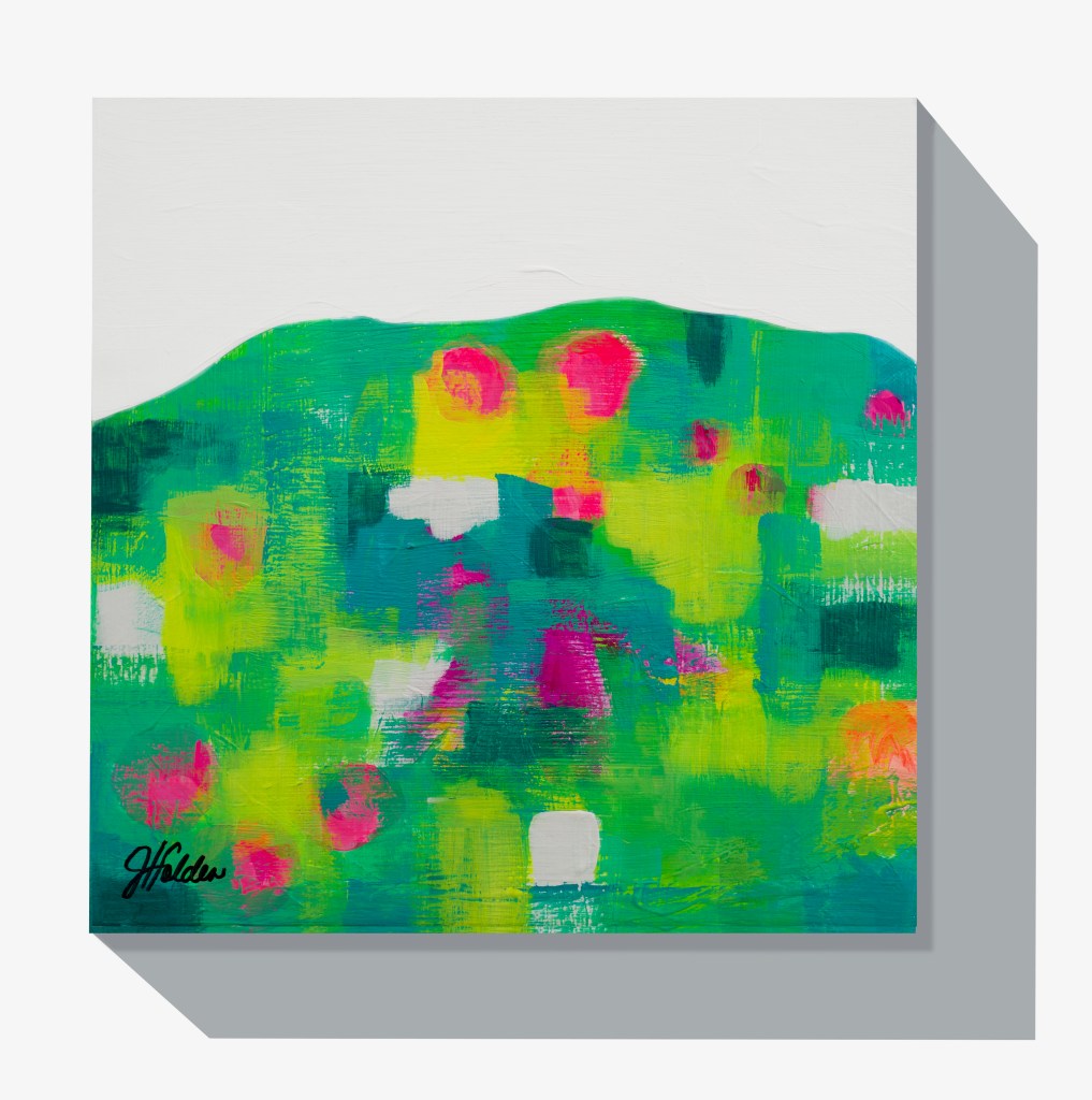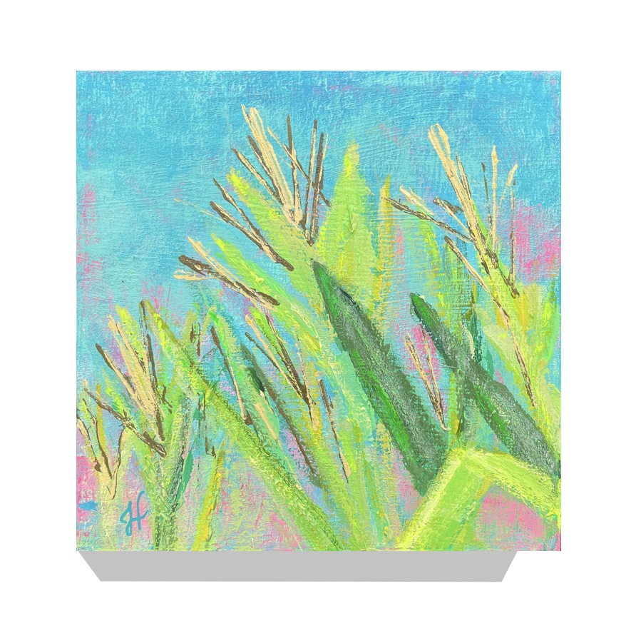 One of my favourite past times became peering through the brown tassels as they waved about in the wind. I could see the vibrant blue summer sky through the bright green corn stalks, the luminous summer colour delighted my eyes. It is these enchanting experiences that remain vivid in my memory that I captured in the painting ‘Peering Through The Field’.